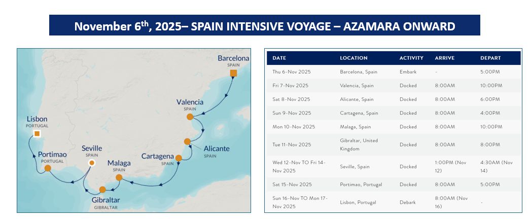 Please join Elizabeth Blount Mccormick and friends for a once in a lifetime curated journey to Spain on Azamara’s Onward. Depart from Barcelona and sail into the heart of the world’s most unique ports and iconic destinations including, Valencia, Alicante, Cartagena, Malaga, Gibraltar, Seville, Portimao and Lisbon. Dig deeper with specialized and private encounters that connect you to the people, traditions, natural wonders, and cultural riches of each destination.